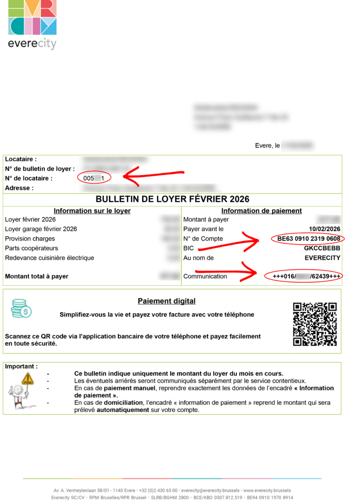 - Par virement : Vous recevez chaque mois un document reprenant le montant total à payer. Vous devez obligatoirement mentionner la communication structurée indiquée sur le document.